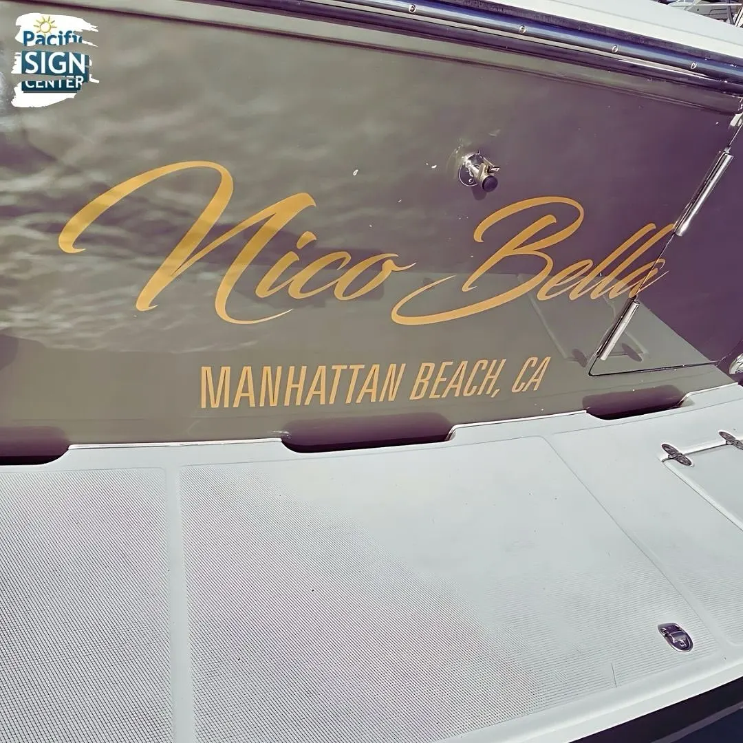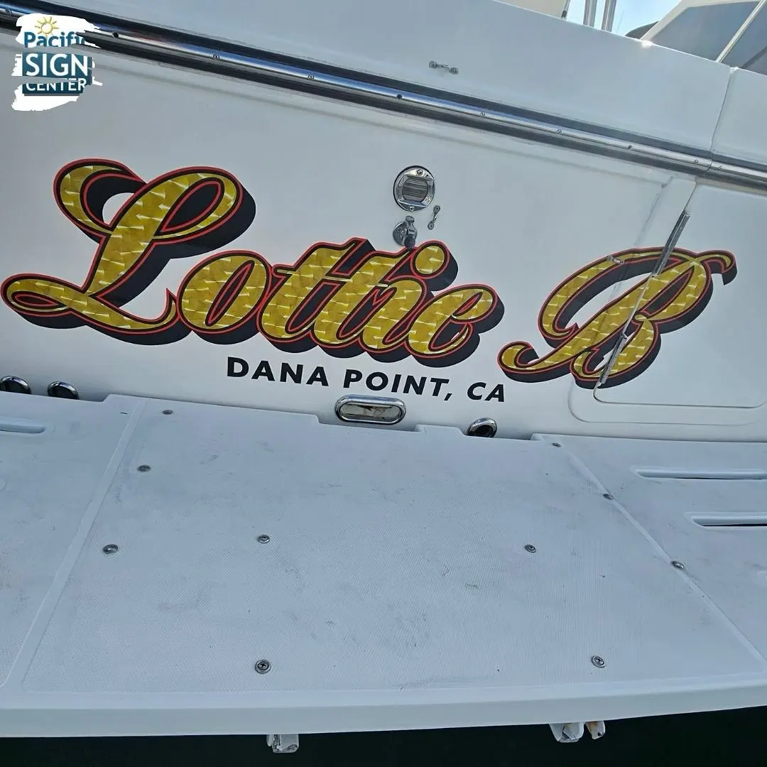 We designed, fabricated, and installed this stunning new boat name for a fishing vessel in Dana Point Harbor! This custom decal features a single-layer digital print cut vinyl with a bold gold engine turn design, perfectly mounted on the transom for that clean, high-end look. Proudly crafted by our team at Pacific Sign Center - where quality and craftsmanship meet the water. #PacificSignCenter #BoatsByPacificSignCenter #DanaPointHarbor #BoatLettering #BoatGraphics #CustomVinyl #BoatDecals #TransomArt #MarineGraphics #BoatLife #SoCalBoating #GoldLeafLook